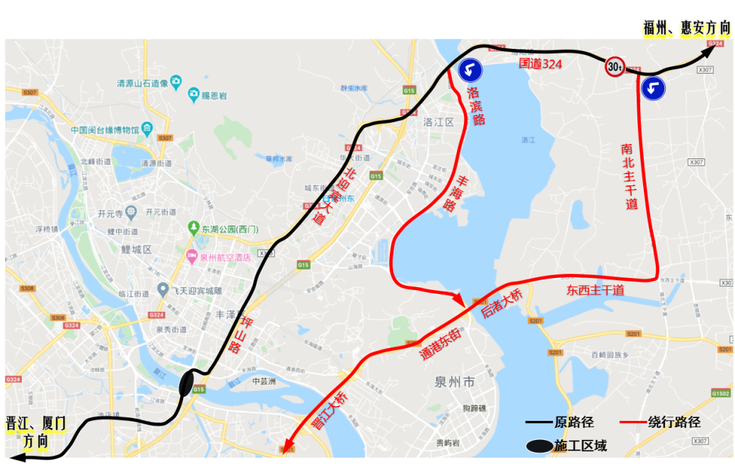 (惠安、福州往晉江、廈門方向車輛繞行路徑圖)